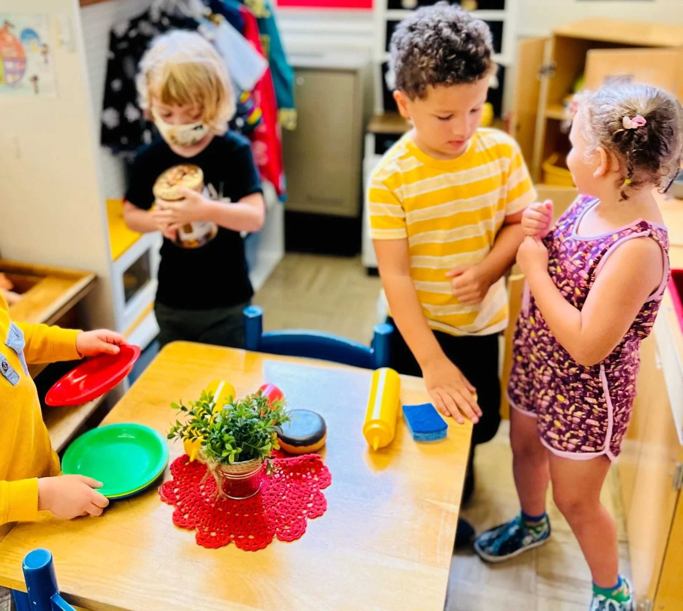 A portion of the classroom is set up as a social dramatic play area. This is another active and busy spot in our classrooms. In this area, children have the opportunity to experiment with adult roles, to use language to plan and play together, to be imaginative and to have fun. Dress-up clothes, dolls and kitchen equipment stock this area. From time to time, this area of the classroom may be transformed into a doctor’s office, a grocery store, a forest, a space station, a castle or a cave. These changes of arrangement prompt fresh and exciting play.