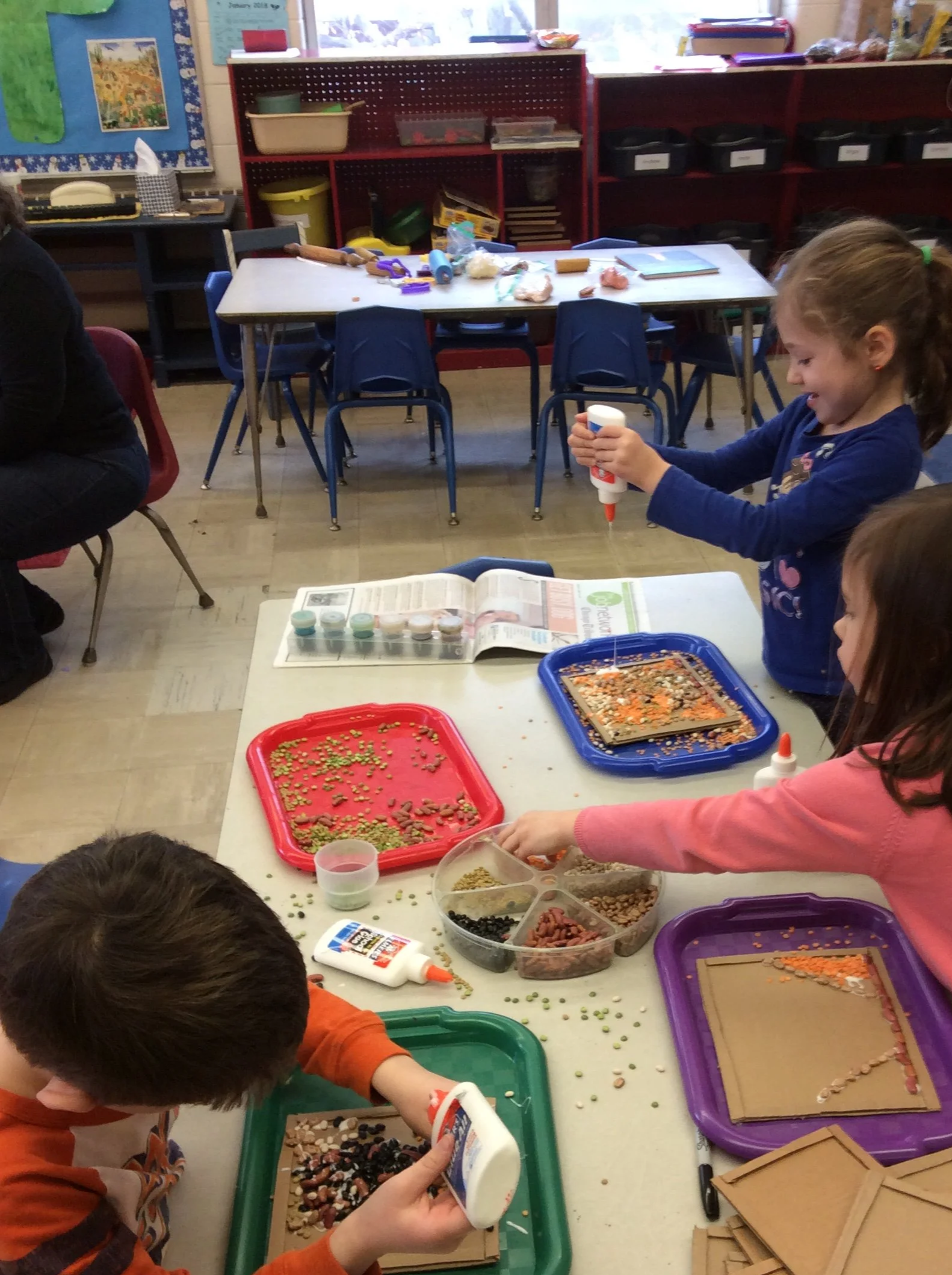 The development of fine motor control is supported through multiple opportunities to use scissors, markers, small manipulatives, play dough, paint brushes and other play materials. Puzzles are an excellent choice for development of eye-hand coordination, as are activities such as bead stringing, lacing and stacking blocks. The classroom environment provides a multitude of opportunities for children’s growth in fine motor development.